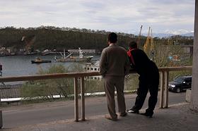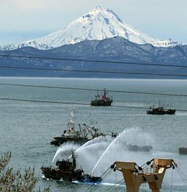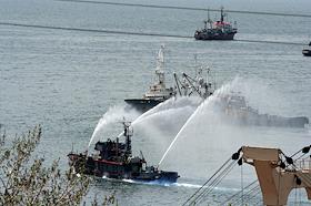 Транспортировка японской шхуны буксирами; локализация аммиака струями пожарного катера. С…