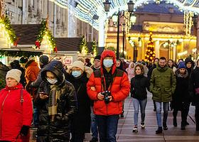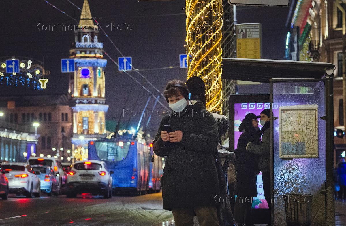 Прохожие в масках на Невском проспекте в Санкт-Петербурге
