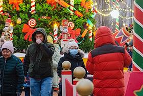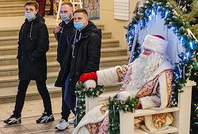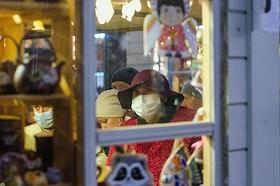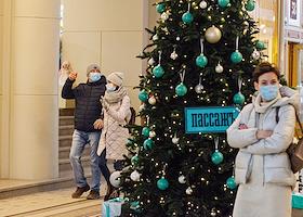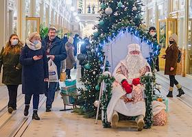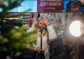 Люди в защитных масках на центральных улицах Санкт-Петербурга и внутри здания "Пассажа".