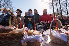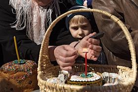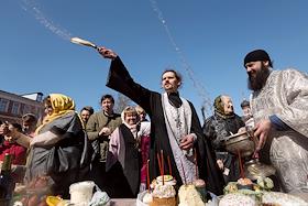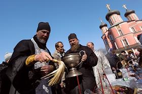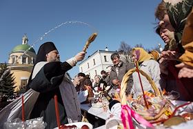 Освящение яиц и куличей накануне праздника Пасхи в Даниловском монастыре в Москве.