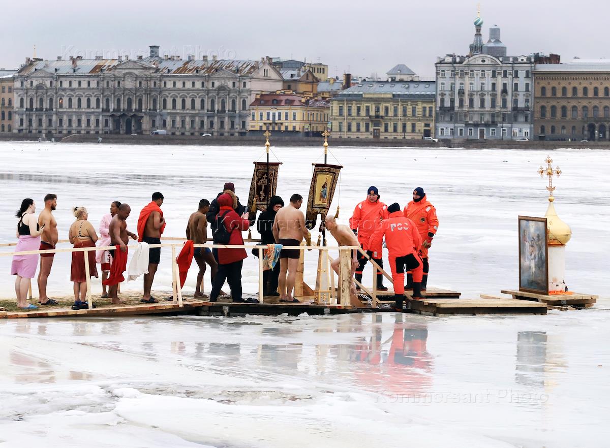 Праздник Богоявления (Крещения) Господня. Верующие во время крещенских купаний на стрелке Заячьего…