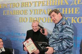Олимпийскому чемпиону Дмитрию Саутину начальник ГУВД Воронежской области Олег Хотин вручил именное…