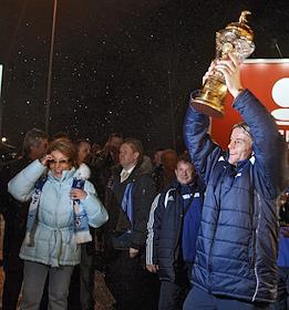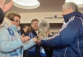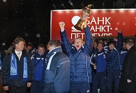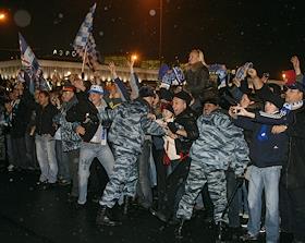 Болельщики футбольной команды "Зенит" празднуют победу своей команды в Чемпионате России. Встреча…