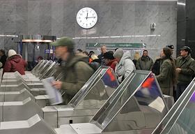 Открытие новой станции метро "Волковская". Люди перед закрытыми дверьми, давка на входе,очередь за…