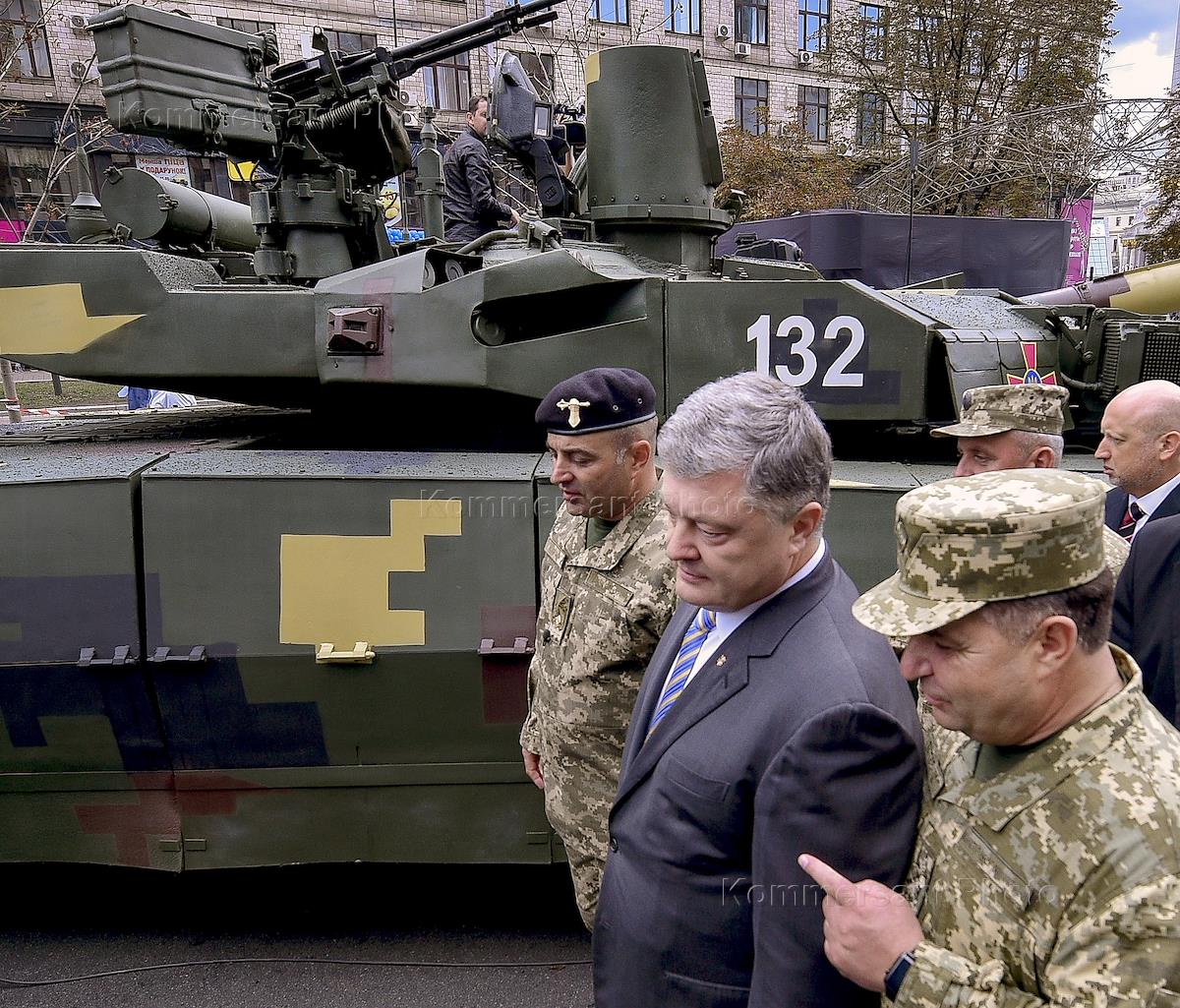 Президент Украины Петр Порошенко во время осмотра выставки вооружения и военной техники по случаю…