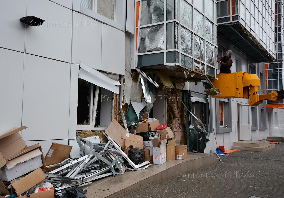 Взрыв на первом этаже пятиэтажного офисного здания на углу Адмиральского проспекта и улицы Краснова.