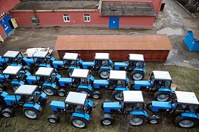 Тракторы - готовая продукция Минского тракторного завода, МТЗ, на стоянке на территории предприятия.