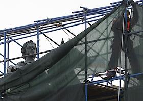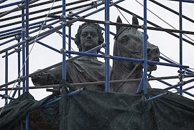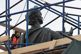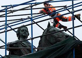 Демонтаж строительных лесов с памятника императору Петру Первому "Медный всадник" на Сенатской…