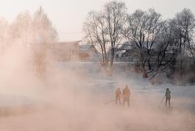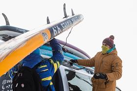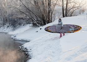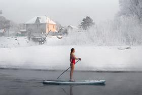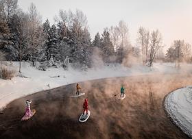 Участники клуба SUP_Novosibirsk во время занятий сапсерфингом на притоке реки Обь в -31 градус