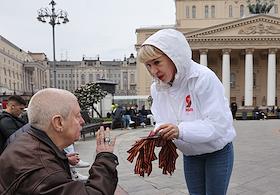 Раздача Георгиевских ленточек волонтерами Москвы на Театральной площади.