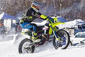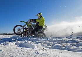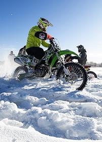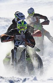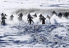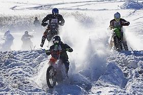 Amateur ATV and motorcycle motocross race in a snowy quarry near Kaliningrad.