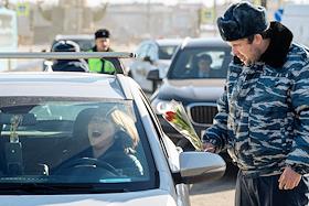 Traffic police officers presenting flowers to female drivers ahead of International Women's Day on…