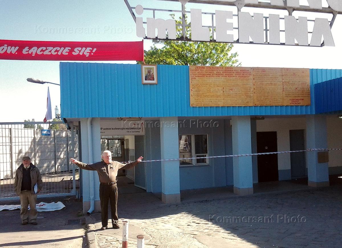 Ворота гданьской судоверфи с востановленной вывеской "Гданьская судоверфь им. Ленина".