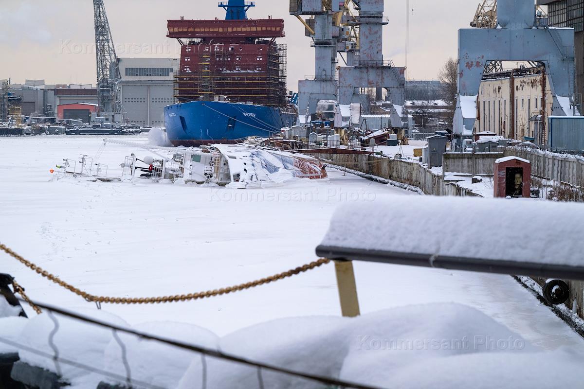 Затонувший буксир "Капитан Ушаков" во льдах реки Большой Невка.