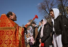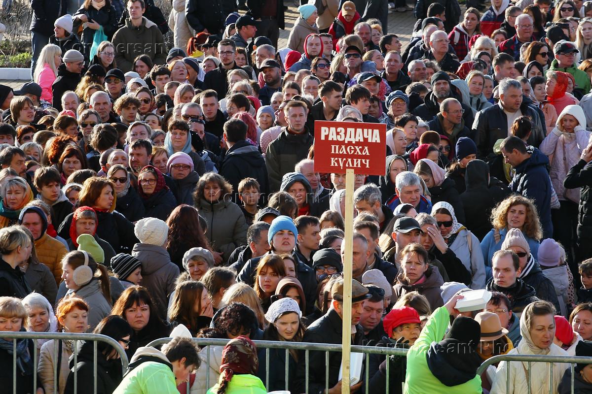 Пасхальный Крестный ход из кремля к храму Александра Невского. Раздача кулича верующим.